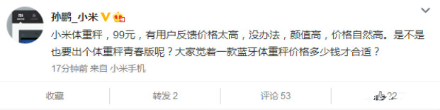 非常在線 2015年9月9日消息,體重是每一個(gè)愛美妹子打死都不能說的秘密,也是她們時(shí)時(shí)刻刻都要知道的重要信息之一,所以可以想象體重秤對(duì)他們的重要性。其實(shí),不止愛美妹子們愛測(cè)體重,健康人士也都很在乎自己體重的變化,只有保持一個(gè)穩(wěn)定健康的體重,才能擁有一個(gè)健康的體格。 體重秤市面上有好多,叫得上名的,叫不上名的有好多,質(zhì)量也是參差不齊。其中,售價(jià)99元的小米體重秤貌似不錯(cuò),不僅具有測(cè)量體重的功能,還能時(shí)實(shí)查看體重變化的曲線,并得到專業(yè)的健康建議,為保持一個(gè)健康身體保駕護(hù)航。1 不過,小米體重秤99元的售價(jià),被不少網(wǎng)友吐槽太貴,畢竟市面上同類產(chǎn)品太多,價(jià)低又好用的體重秤也多的是。也許是為了提高競(jìng)爭(zhēng)力,拉攏更多消費(fèi)者的心,根據(jù)小米員工微博曝光,小米似乎要推出一款廉價(jià)的體重秤新品,按照爆料者的說法,小米新款體重秤叫“小米體重秤青春版”。2 然而微博中除了說,小米可能會(huì)推出小米體重秤青春版外,并沒有透露更多其他相關(guān)信息,比如新品體重秤都有哪些亮點(diǎn)、價(jià)格到底有多低廉等。而這些信息我們只能等時(shí)間來一一為我們揭曉了。