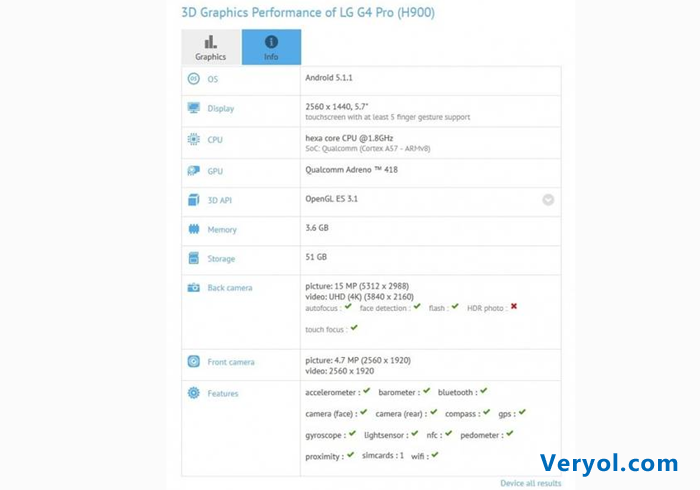 根據GFXBench數據庫數據信息顯示,LG?G4?Pro型號為H900,核心方面將搭載高通驍龍808處理器,配備5.7英寸QHD顯示屏屏幕分辨率更是達到了2K級別,內存采用的是4GB大小,內存容量比LG?G4多出1GB。