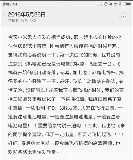 非常在線?2016年5月26日消息,盼望著盼望著,小米無人機(jī)終于在昨日天晚上正式發(fā)布了。因?yàn)閷τ谠S多無人機(jī)愛好者來說,大疆無人機(jī)不僅是心儀的對象,更是夢寐以求的寶貝。而小米無人機(jī)又將大疆精靈3視為死敵,且很早就傳出小米首款無人機(jī)將會(huì)擁有超高的性價(jià)比,所以小米無人機(jī)的發(fā)布,關(guān)注度自然低不了。 不過,昨天晚上小米無人機(jī)的表現(xiàn),似乎并盡人如意。據(jù)悉,在發(fā)布會(huì)結(jié)束后,小米員工@瘋狂的楊林在微博上為網(wǎng)友們直播小米無人機(jī)拍攝畫面,但沒開始多久,直播就終止了。于是網(wǎng)友們都紛紛猜測,是不是小米無人機(jī)墜機(jī)了,才導(dǎo)致直播無法進(jìn)行的。 2 對于大家的猜測,@瘋狂的楊林在今日凌晨發(fā)微博長文進(jìn)行了澄清,稱小米無人機(jī)直播中發(fā)生墜機(jī)事件是誤傳,并解釋說,直播中斷是因?yàn)樽约涸诘谝淮卧囷w時(shí),沒有注意到飛機(jī)的電池已經(jīng)處于低電量狀態(tài)了,所以在飛出去一段時(shí)間后,飛機(jī)發(fā)生了自動(dòng)降落,才導(dǎo)致了直播的中斷。 3 1對于以上的說法,有人表示認(rèn)可,也有人表示懷疑。因?yàn)闊o人機(jī)在起飛前要充好電,應(yīng)該算是一個(gè)常識(shí)了,而且昨天晚上還是小米無人機(jī)首次在網(wǎng)友面前試飛,所以前期準(zhǔn)備工作自然馬虎不得。此外,還有網(wǎng)友懷疑該直播是事先錄好的,甚至懷疑直播畫面根本就不是由那臺(tái)無人機(jī)傳出的。 4 另外,不管是大疆無人機(jī),還是和小米無人機(jī)同規(guī)格的產(chǎn)品,售價(jià)都不低。而小米無人機(jī)1080p版的售價(jià)僅2499元,4K版的也僅2999元,所以難免會(huì)讓人產(chǎn)生價(jià)格影響品質(zhì)的念頭。 那么,對于小米無人機(jī)首發(fā)就發(fā)生了“墜機(jī)”事件!你怎么看?認(rèn)為是一次意外呢,還是?
