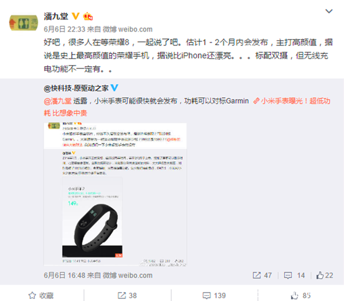 潘九堂寫道:好吧,很多人在等榮耀8,一起說(shuō)了吧。估計(jì)在1-2個(gè)月內(nèi)會(huì)發(fā)布,主打高顏值,據(jù)說(shuō)是史上最高顏值的榮耀手機(jī),據(jù)說(shuō)比iphone還漂亮…標(biāo)配雙攝,但無(wú)線充電功能不一定有。